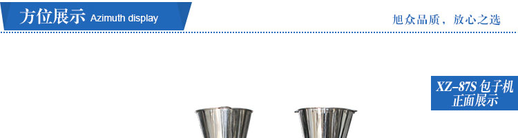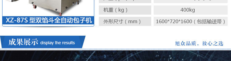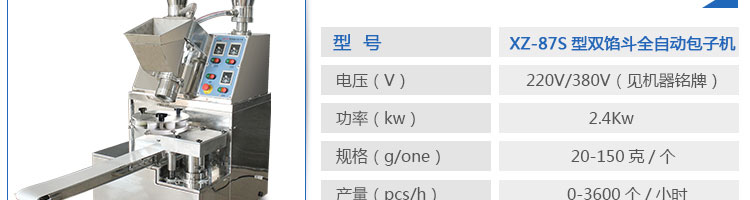 XZ-87S型雙餡斗全自動包子機,可生產(chǎn)各種肉包、肉菜包、菜包、小籠包、湯包、水晶包、圓饅頭、奶黃包、豆沙包、叉燒包、南瓜餅等幾十種包餡制品。適用于賓館、飯店、學校、機關企業(yè)食堂、饅頭或包子加工廠、早餐工程店及速凍食品廠等單位。可滿足不同客戶群體。免費提供工藝技術。免費上門培訓指導安裝。