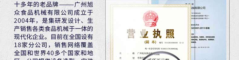 廣州旭眾食品機(jī)械有限公司是一家集科研開發(fā),生產(chǎn)設(shè)計(jì),營銷服務(wù)為一體的現(xiàn)代化生產(chǎn)企業(yè)。現(xiàn)代化生產(chǎn)車間,精湛制造技術(shù),所產(chǎn)機(jī)械歷經(jīng)市場(chǎng)重重考驗(yàn),不斷贏得海內(nèi)外客戶的贊譽(yù)。