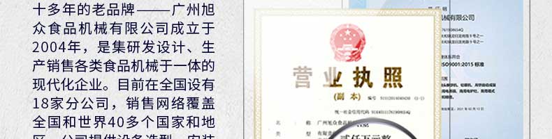 廣州旭眾食品機械有限公司是一家集科研開發,生產設計,營銷服務為一體的現代化生產企業。現代化生產車間,精湛制造技術,所產機械歷經市場重重考驗,不斷贏得海內外客戶的贊譽。
