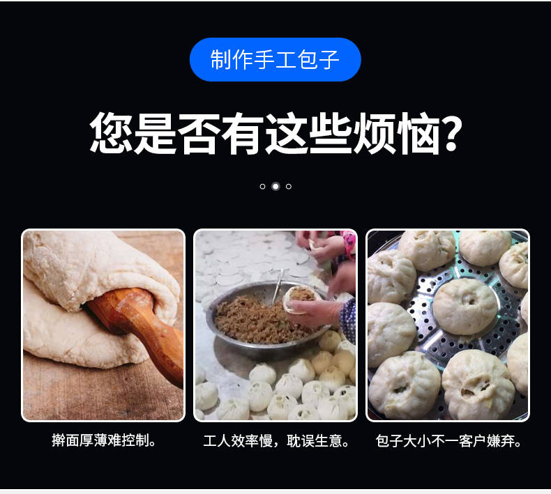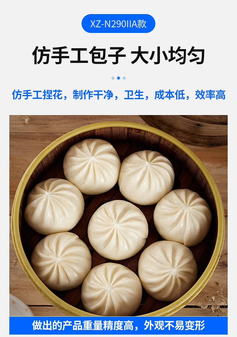 XZ-N290IIA卷面式包子機,壓面成型面皮,卷面方式包餡。仿手工捏花、一次成型、表面光滑、口感勁道。面餡可調、制品多樣。產品重量精度高,規格,大小,面皮的厚度皆可調控。