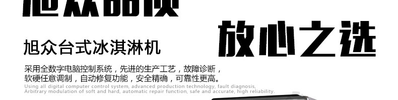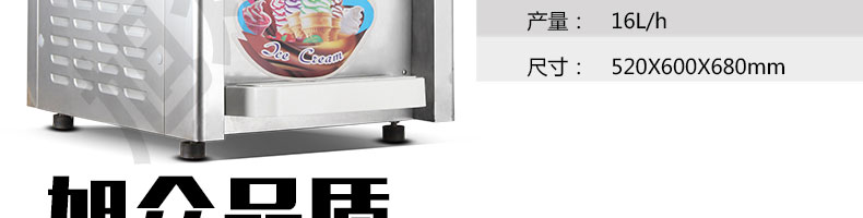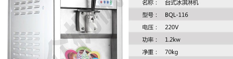 BQL-116臺式冰淇淋機,●選用國際名牌成熟制冷配套件和高效壓縮機,融合旭眾精湛工藝輔以嚴格的質量控制流程,使產品整體性能及品質得以全面提升。●采用全數字電腦控制系統,選用名牌優質電器元件,先進的生產工藝,故障診斷,軟硬任意調制,自動修復功能,安全精確,可靠性更高?!駥I成熟制冷系統設計,選用世界名牌大功率專用壓縮機,大大縮短冰淇淋成型時間,相同時間內冰淇淋產量大幅度增加,使您生意火爆時依然得心應手,為您創造財富?!癜踩椒€的機械攪拌系統,噪音更低、振動更小,使整機運行性能達到國際先進水平?!翊_保進料溫度在0°C~35°C;環境溫度5°C~40°C勻可正常使用。