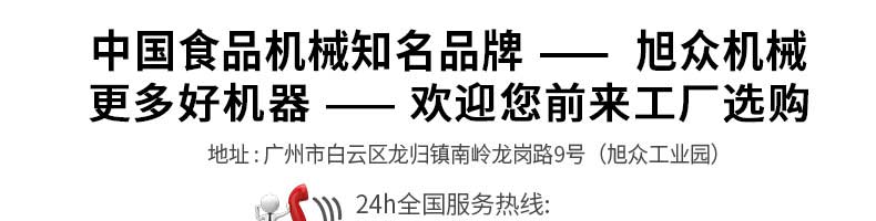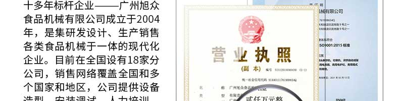 廣州旭眾食品機械有限公司是一家集科研開發,生產設計,營銷服務為一體的現代化生產企業。現代化生產車間,精湛制造技術,所產機械歷經市場重重考驗,不斷贏得海內外客戶的贊譽。