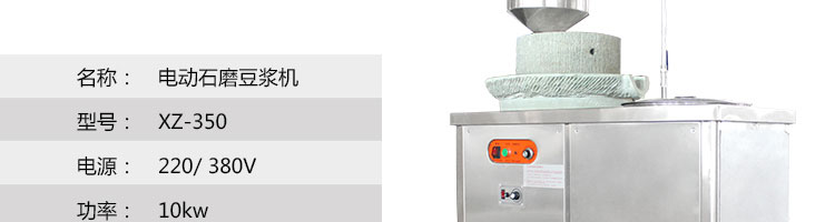 名稱XZ-350型電動石磨豆漿機 電源220/380V 功率10kw 產量30kg/h 尺寸1000*550*1100mm 重量 規格 其他