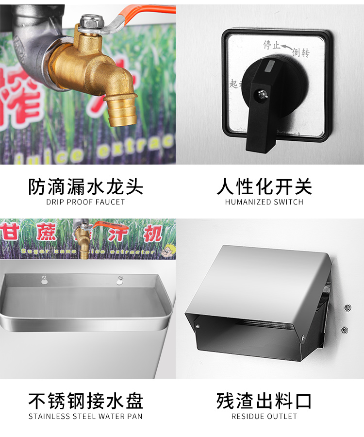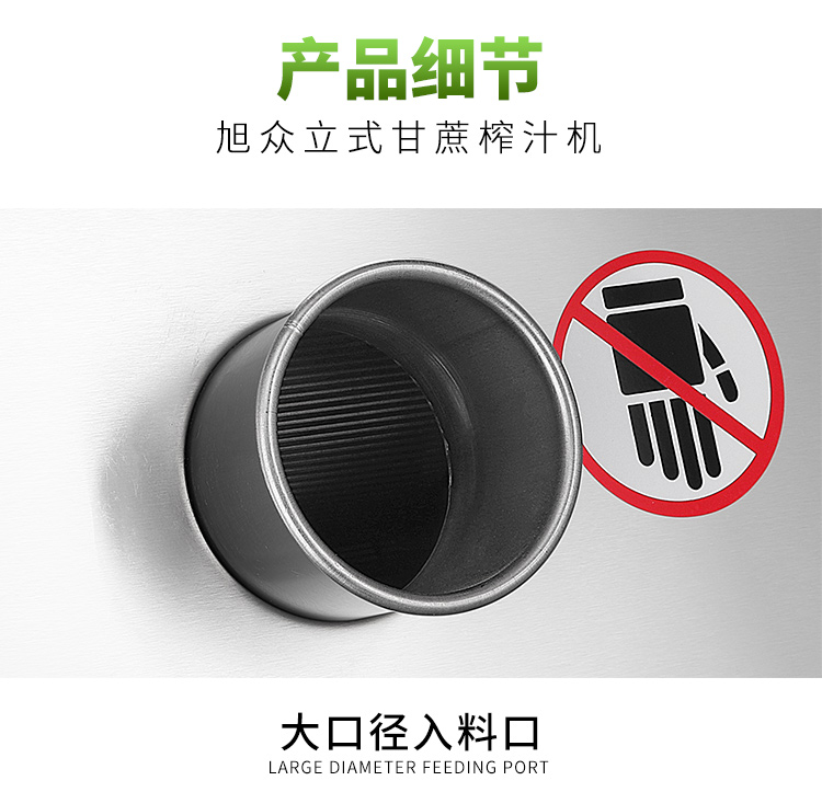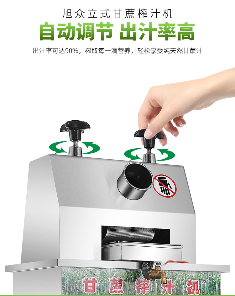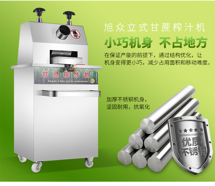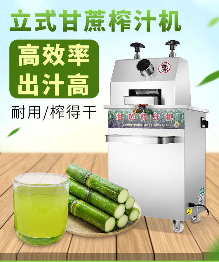 立式甘蔗機,該機采用不銹鋼材質加工,機頭部件都經過嚴格的防銹仿腐蝕處理,整機采用全封閉結構,可內置蔗渣桶,保證渣汁不外泄,安全、干凈、衛生。 適合賓館、卡拉OK廳、水果店、冷飲店、涼茶店、車站、超市等服務行業壓榨各種甘蔗之用。