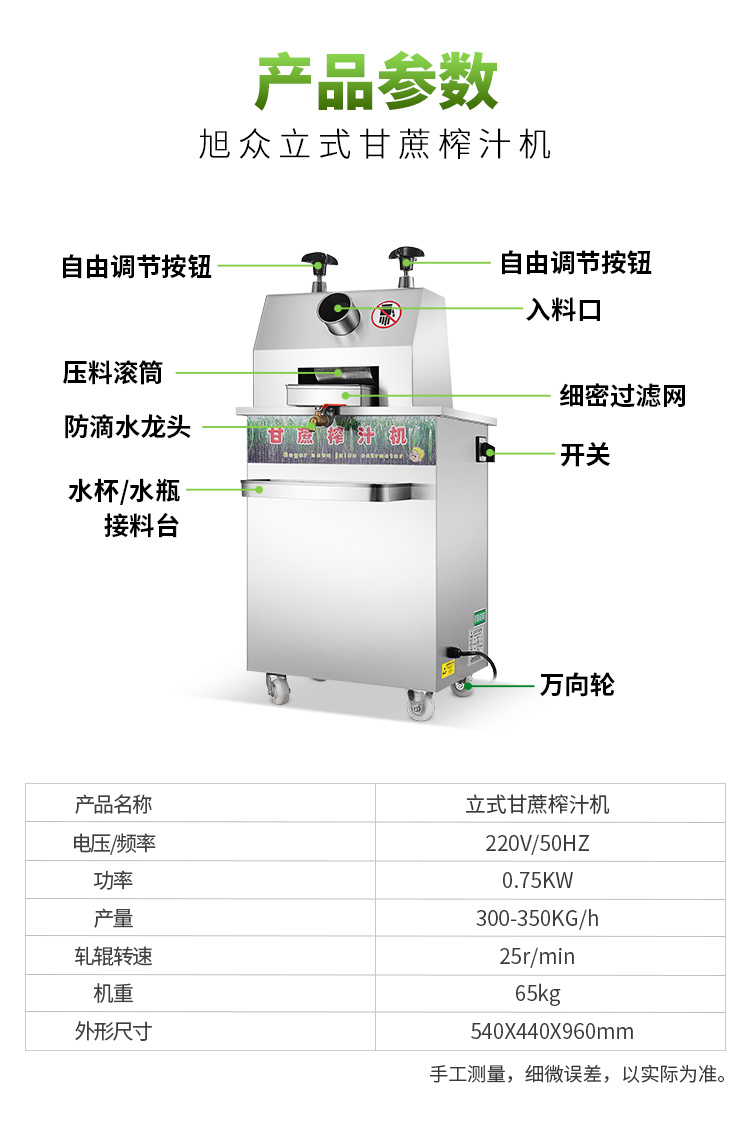 名稱立式甘蔗機 電源220V/50Hz 功率0.75kw 產量300-350kg/h 尺寸外形尺寸540*440*960mm 重量65kg 規格 其他