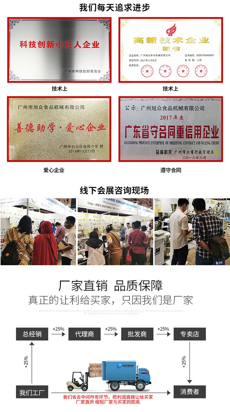 廣州旭眾食品機械有限公司是一家集科研開發,生產設計,營銷服務為一體的現代化生產企業?,F代化生產車間,精湛制造技術,所產機械歷經市場重重考驗,不斷贏得海內外客戶的贊譽。