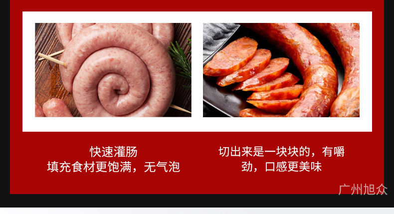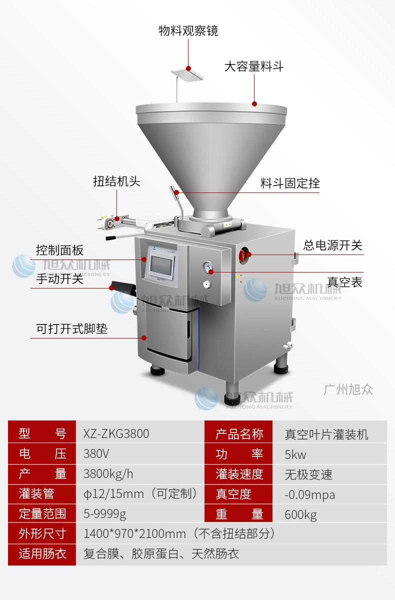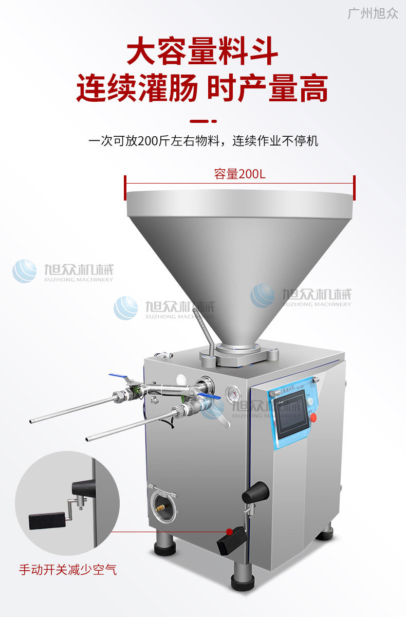 XZ-ZKG2800真空灌腸機,真空葉片灌裝機連續作業加料后不需停機,可灌肉粒&肉糜實用性強灌各種腸可做烤腸、親親腸、廣式臘腸、火鍋腸等連續灌制長腸。