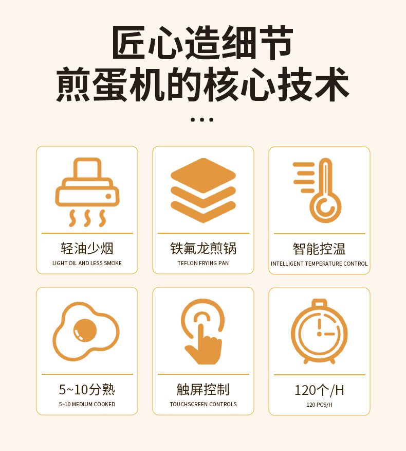 商用全自動智能煎蛋機,匠心造細節煎蛋機的核心技術,輕油少煙、5~10分熟、鐵氟龍煎鍋、觸屏控制、智能控溫??谖秱€性化五分/七分/十分熟,智能控溫上下鍋恒溫煎烤。