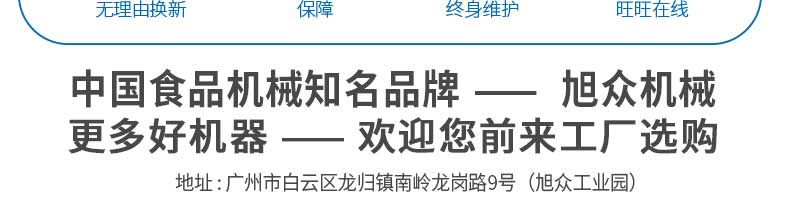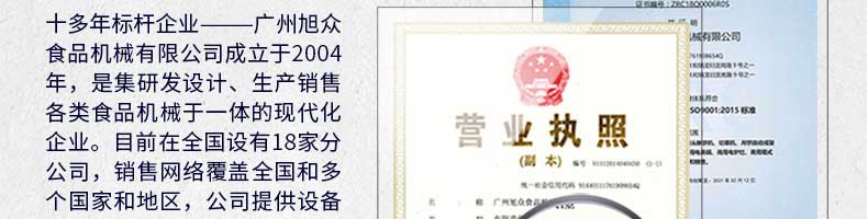 廣州旭眾食品機械有限公司是一家集科研開發,生產設計,營銷服務為一體的現代化生產企業?,F代化生產車間,精湛制造技術,所產機械歷經市場重重考驗,不斷贏得海內外客戶的贊譽。