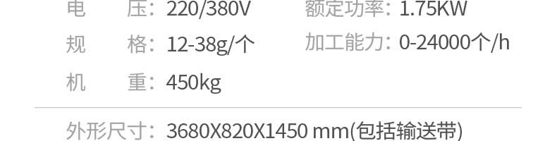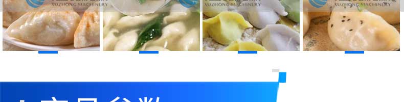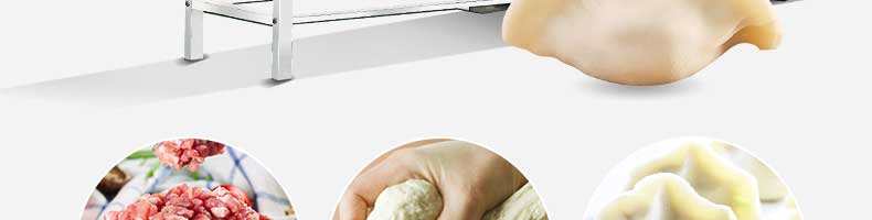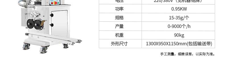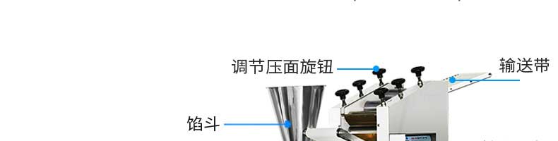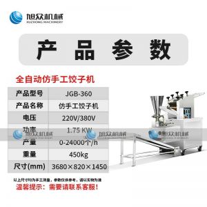 名稱JGB-360仿手工餃子機 電源220/380v 功率1.75kw 產量0-24000個/h 尺寸3680*820*1450mm 重量450kg 規格12-38g/個 其他