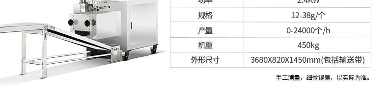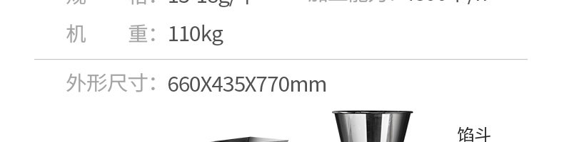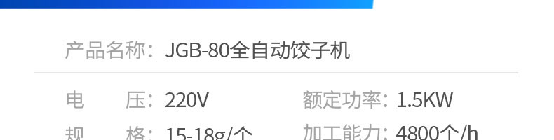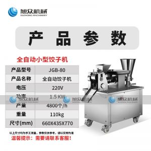 名稱80餃子機 電源220v 功率1.5kw 產量4800個/h 尺寸660*435*770mm 重量110kg 規格15-18g/個 其他