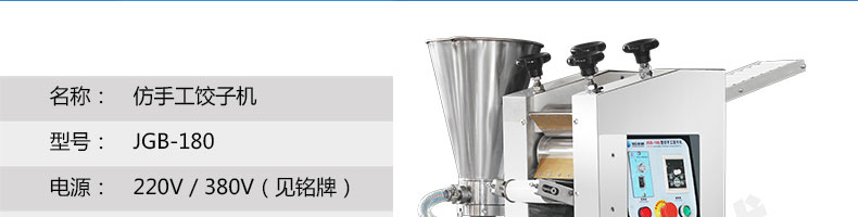 名稱JGB-180餃子機 電源220/380V(見機器名牌) 功率0.95kw 產量0-9000個/小時 尺寸外形尺寸1300*950*1150mm 重量90kg 規格15-35克/個 其他