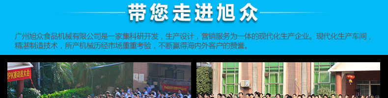 廣州旭眾食品機械有限公司是一家集科研開發,生產設計,營銷服務為一體的現代化生產企業。現代化生產車間,精湛制造技術,所產機械歷經市場重重考驗,不斷贏得海內外客戶的贊譽。
