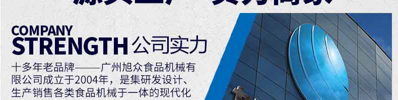 廣州旭眾食品機械有限公司是一家集科研開發,生產設計,營銷服務為一體的現代化生產企業。現代化生產車間,精湛制造技術,所產機械歷經市場重重考驗,不斷贏得海內外客戶的贊譽。