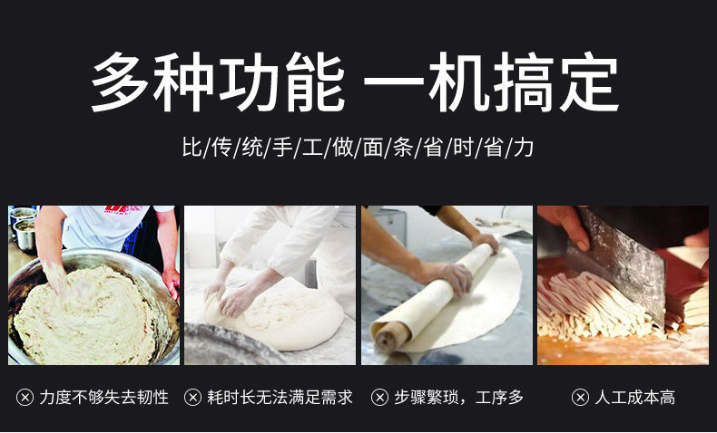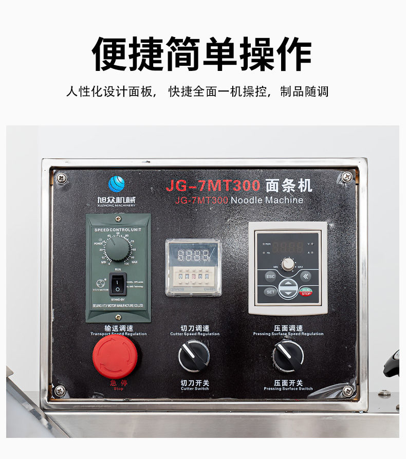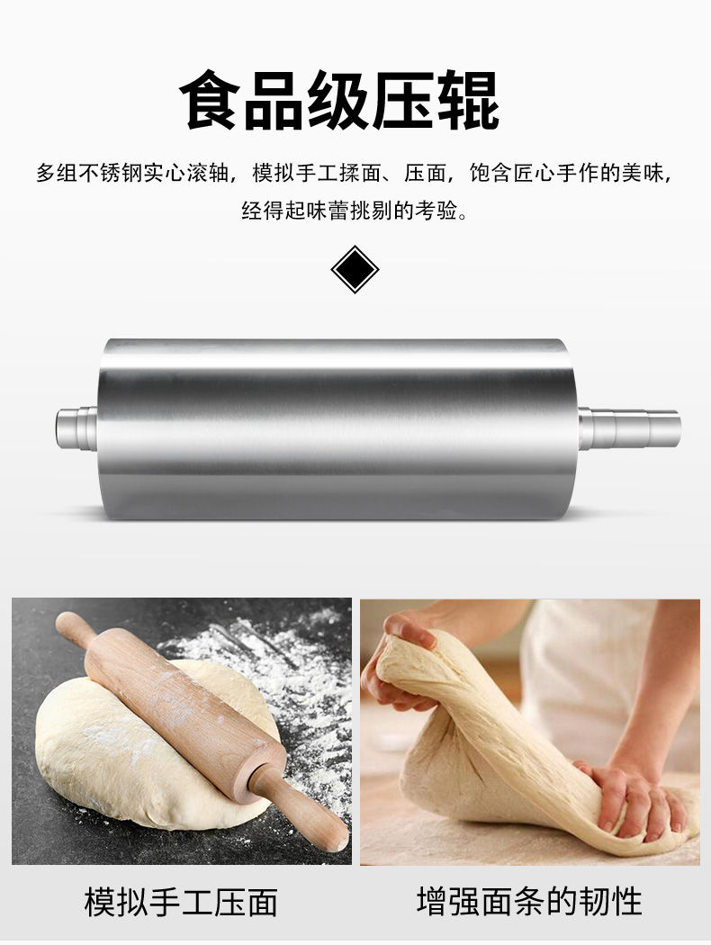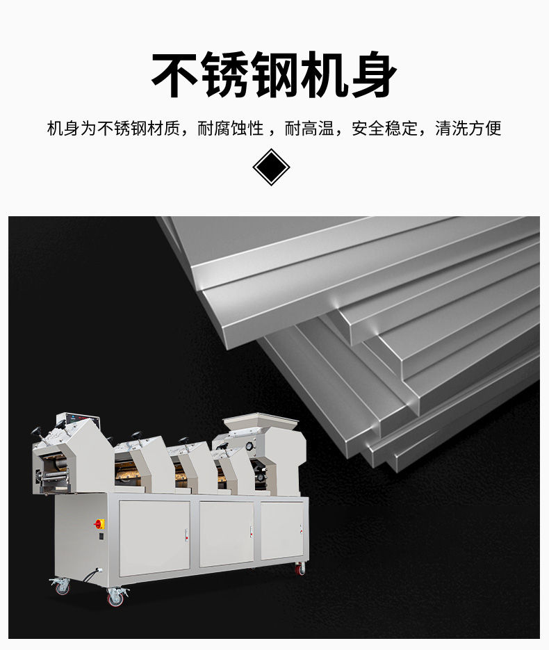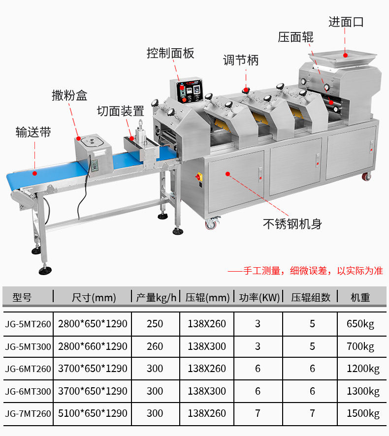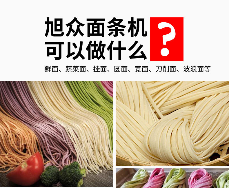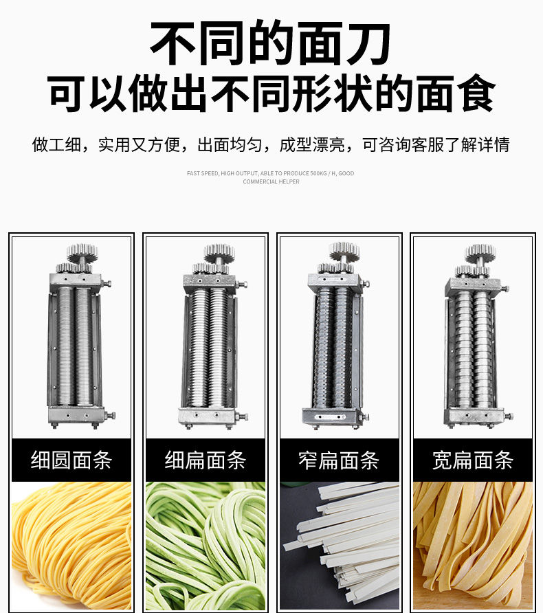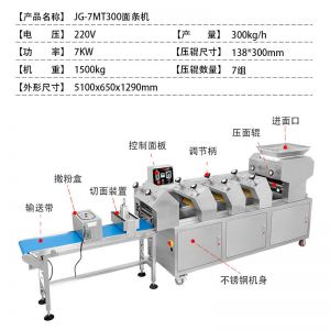 JG-7MT300面條機,多種功能一機搞定比傳統手工做面條,省時省力。可以做什么鮮面、蔬菜面、掛面、圓面、寬面、刀削面、波浪面等。不同的面刀可以做出不同形狀的面食做工細,實用又方便,出面均勻,成型漂亮。