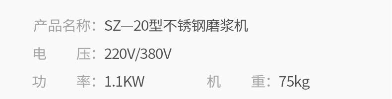 名稱SZ-20不銹鋼磨漿機 電源220/380v 功率1.1kw 產量 尺寸607*350*1020mm 重量75kg 規格 其他