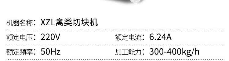 名稱XZL禽類切塊機 電源220V 功率1100W 產量300-400kg/H 尺寸 重量80kg 規格 其他