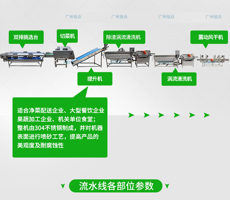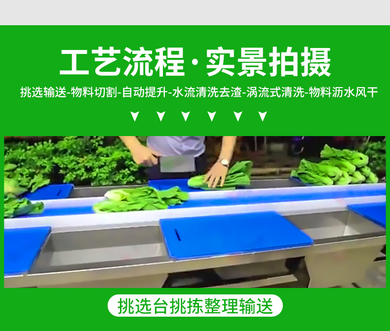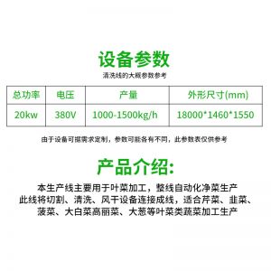 名稱全自動大型葉菜清洗線 電源20kw 功率380V 產量1000-1500kg/h 尺寸18000mm*1460mm*1550mm 重量請資詢銷售員 規格請資詢銷售員 其他