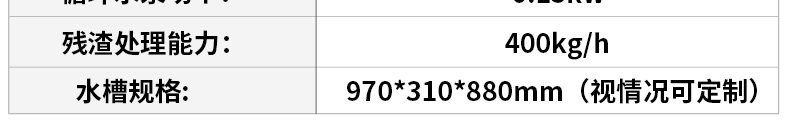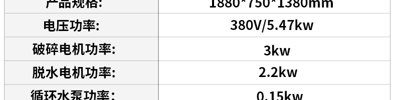 名稱廚房垃圾處理器 電源380v 功率547kW 產量殘渣處理能力:400kg/h 尺寸1880*750*1380mm 重量請咨詢銷售員 規格水槽規格:970*310*880mm(視情況可定制) 其他破碎電機功率:3kW,脫水電機功率:2.2kW,循環水泵功率:0.15kW