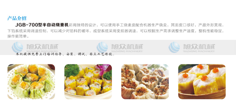 JGB-700燒麥機,采用特的設計,可以使用手工燒麥皮配合機器生產燒賣,其面皮口感好,產品外形美觀下餡系統采用調速控制,可以減少對餡料的破壞,成型系統呆用變頻器調速,可以根據生產需求調整生產速度,整機性能穩定操作更簡單