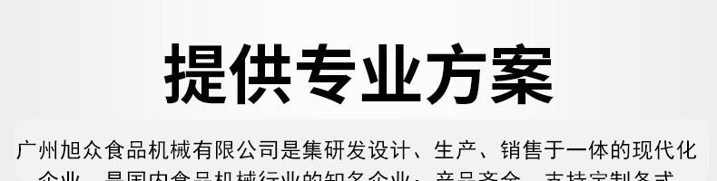廣州旭眾食品機(jī)械有限公司是一家集科研開發(fā),生產(chǎn)設(shè)計(jì),營銷服務(wù)為一體的現(xiàn)代化生產(chǎn)企業(yè)。現(xiàn)代化生產(chǎn)車間,精湛制造技術(shù),所產(chǎn)機(jī)械歷經(jīng)市場重重考驗(yàn),不斷贏得海內(nèi)外客戶的贊譽(yù)。
