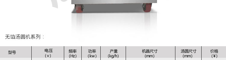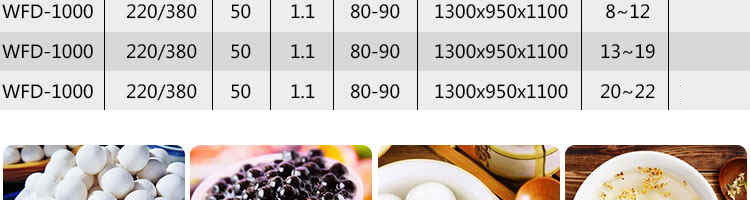 名稱VFD-1000無餡湯圓機 電源220/380V(見機器名牌) 功率1.1kw 產量20-50kg/h(規格不同,產量不同) 尺寸外形尺寸1300*950*1100mm 重量 規格8-34mm 其他