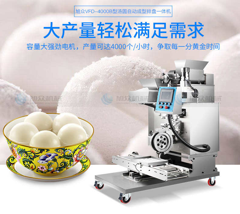 VFD-4000B湯丸機,告別手工時代旭僉多功能湯圓機輕松解決問題。大產量輕松滿足需求容量大強勁電機,產量可達4000個小時,爭取每一分黃金時間