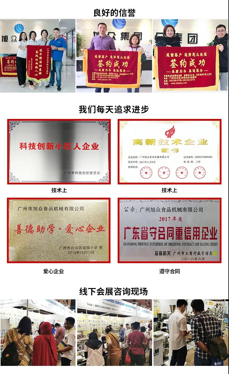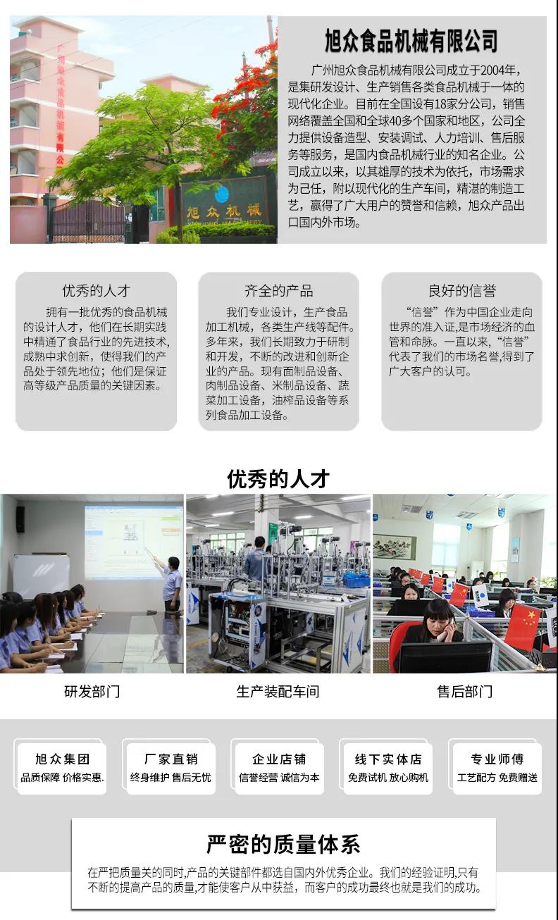 廣州旭眾食品機械有限公司是一家集科研開發(fā),生產(chǎn)設(shè)計,營銷服務(wù)為一體的現(xiàn)代化生產(chǎn)企業(yè)。現(xiàn)代化生產(chǎn)車間,精湛制造技術(shù),所產(chǎn)機械歷經(jīng)市場重重考驗,不斷贏得海內(nèi)外客戶的贊譽。