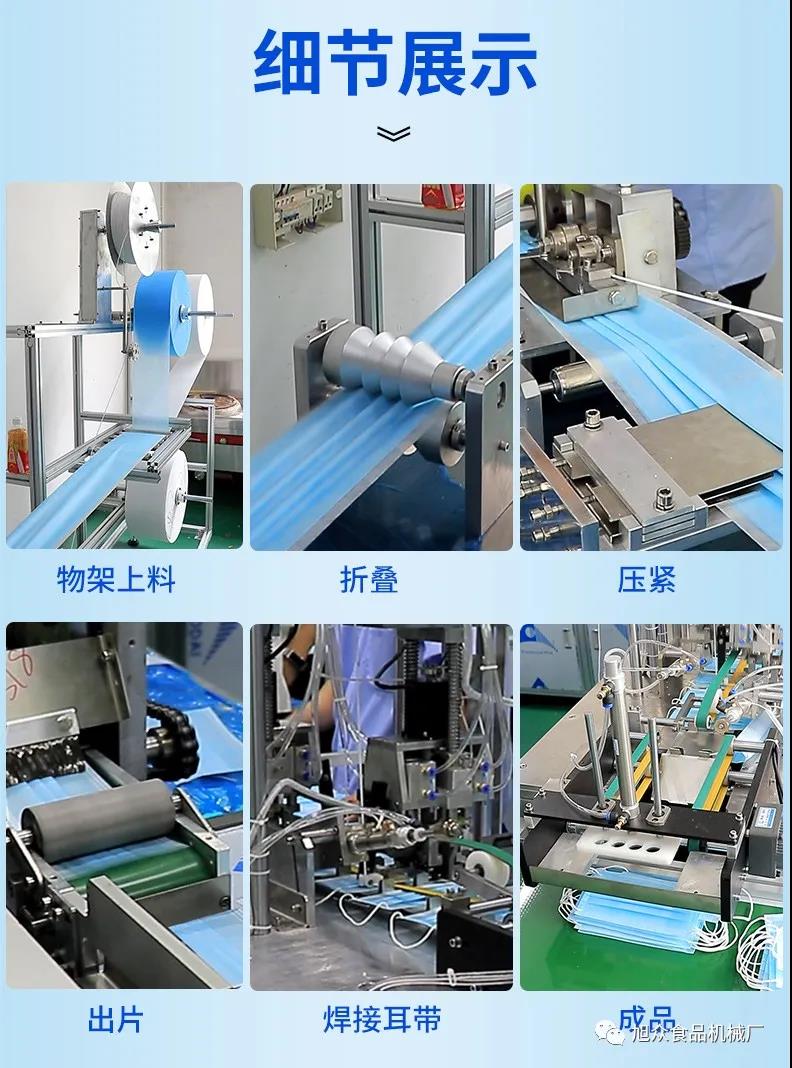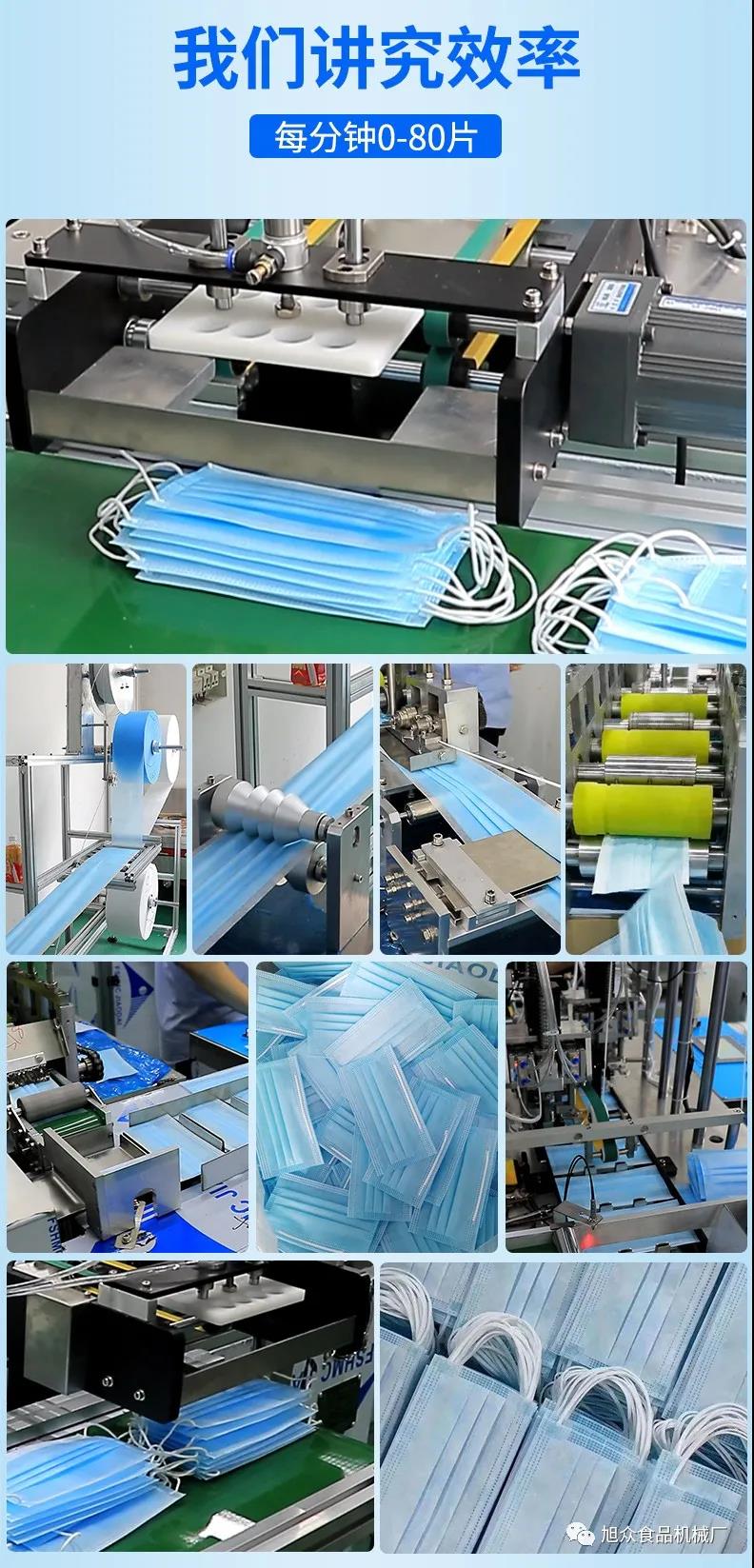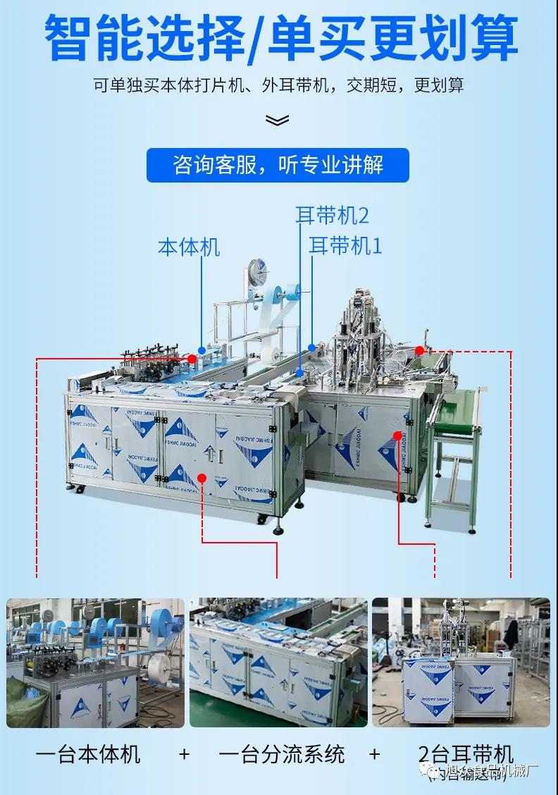 旭眾牌一拖二口罩機(jī)由一臺(tái)本體機(jī)帶動(dòng)兩臺(tái)耳帶機(jī)組成。本體機(jī)輸出ロ罩本體后,由輸送帶結(jié)構(gòu)將口罩本體片輸送到連接耳帶機(jī)的輸送帶上,再通過(guò)輸送帶將口罩片輸送到耳帶機(jī)的正面第一個(gè)口罩盤上方,最后通過(guò)氣缸下壓把口罩片放置到耳帶機(jī)的口罩盤內(nèi),后續(xù)由耳帶機(jī)完成口罩的耳帶熔接,包邊等動(dòng)作,從而完成一個(gè)耳帶口罩產(chǎn)品的生產(chǎn)。本機(jī)采用PLC、觸摸屏控制、主傳送帶采用單相馬達(dá)輸送、步進(jìn)馬達(dá)翻轉(zhuǎn),傳動(dòng)精確,控制穩(wěn)定,速度可調(diào)。