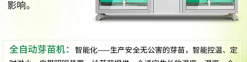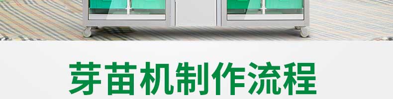 芽苗機系列,全自動芽苗機:智能化一生產安全無公害的芽苗,智能控溫、定時淋水、自帶照明裝置,給芽苗提供一個適宜生長的溫度,濕度,個人即可輕松搞定,實現每天循環生產芽苗!