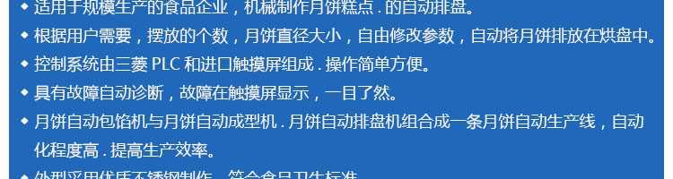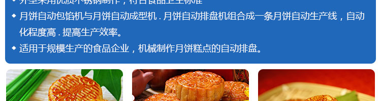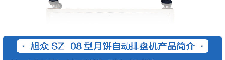 SZ-08型月餅自動排盤機,可同于制作各種月餅。適用于蛋糕房、休閑食品廠、食品加工產、面包房、月餅加工廠、超市、學校、食堂等各種工作場所。可滿足不同客戶群體。免費提供工藝技術。