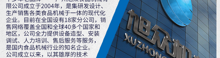 廣州旭眾食品機械有限公司是一家集科研開發,生產設計,營銷服務為一體的現代化生產企業。現代化生產車間,精湛制造技術,所產機械歷經市場重重考驗,不斷贏得海內外客戶的贊譽。
