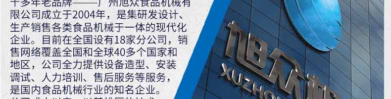 廣州旭眾食品機(jī)械有限公司是一家集科研開(kāi)發(fā),生產(chǎn)設(shè)計(jì),營(yíng)銷服務(wù)為一體的現(xiàn)代化生產(chǎn)企業(yè)。現(xiàn)代化生產(chǎn)車間,精湛制造技術(shù),所產(chǎn)機(jī)械歷經(jīng)市場(chǎng)重重考驗(yàn),不斷贏得海內(nèi)外客戶的贊譽(yù)。