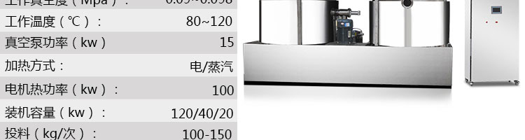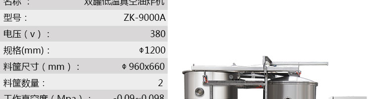 名稱zk-1200雙罐低溫真空油炸機 電源380V 功率22+7.5kw 產量100-300kg/次 尺寸4700*2500*3000mm 重量 規格料框數量1組;加熱方式:導熱油 其他