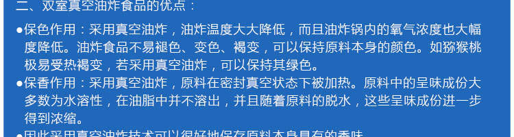 zk-1200雙罐低溫真空油炸機,適用于水果類、蔬菜類、干果類、水產品機畜禽肉類等。油炸食品不易褪色、褐色,可以保持原料本身的顏色